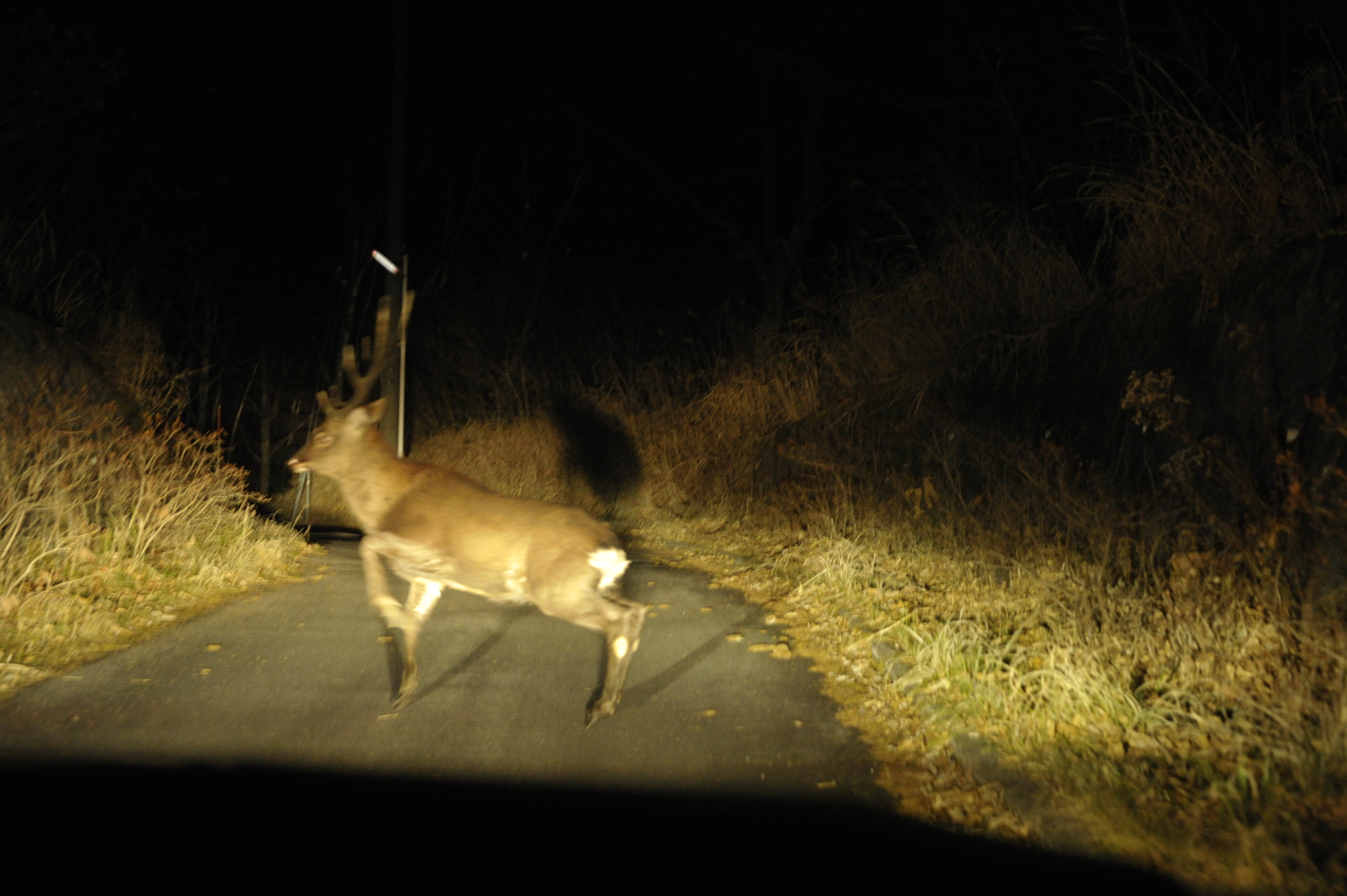 すると、森の中で「ガサ、、、ガサ,,,」と獣が歩く音。多分先ほどの雄鹿だろうと思い目を凝らすが当然何も見えません。