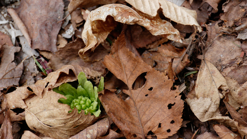 朝起きて外に出ると春の到来を知らせるフキが力強く枯れ葉の隙間から芽を出していた。